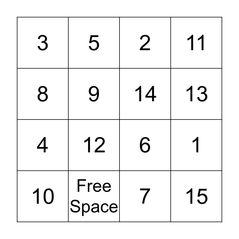 This bingo card has 16 words: Free Space, 1, 2, 3, 4, 5, 6, 7, 8, 9, 10, 11, 12, 13, 14 and 15.