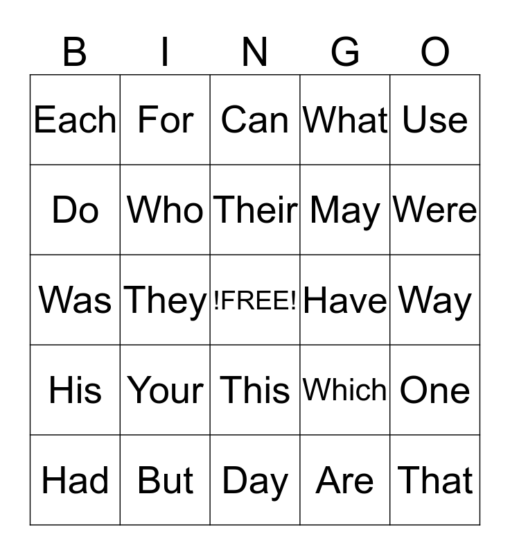 This bingo card has a free space and 34 words: So, Go, No, See, Way, Do, Who, Day, May, That, Was, For, Are, With, His, They, This, Have, One, Had, But, Not, What, Were, When, Your, Can, Said, Use, Each, There, Their, Which and How.