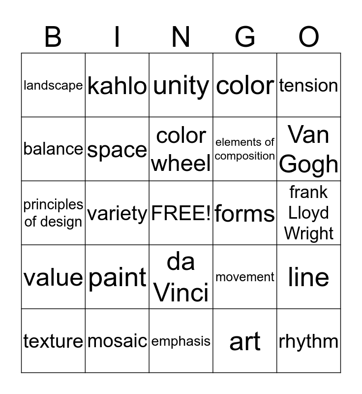 This bingo card has a free space and 24 words: paint, mosaic, color wheel, texture, tension, landscape, balance, kahlo, forms, da Vinci, elements of composition, principles of design, movement, line, space, art, frank Lloyd Wright, unity, Van Gogh, variety, rhythm, value, color and emphasis.