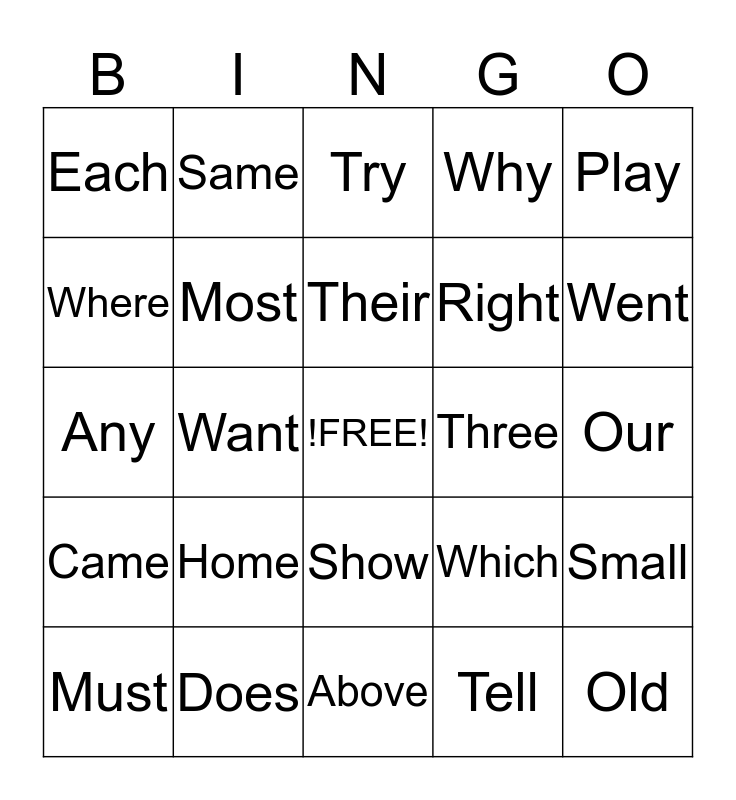 This bingo card has a free space and 34 words: Well, Work, Back, Give, Our, Where, Most, Above, Right, Old, Any, Same, Tell, Boy, Came, Want, Show, Three, Small, Must, Does, Here, Why, Went, Need, Home, Try, Hand, Play, Each, There, Their, Which and How.