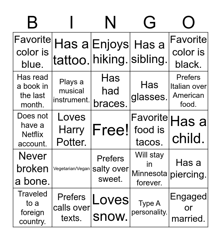 This bingo card has a free space and 29 words: Traveled to a foreign country., Only child., Loves Harry Potter., Prefers a cat over a dog., Favorite color is blue., Enjoys hiking., Plays a musical instrument., Vegetarian/Vegan, Favorite food is tacos., Prefers calls over texts., Has a child., Engaged or married., Loves snow., Type A personality., Prefers Italian over American food., Traveled out of the state., Prefers salty over sweet., Never broken a bone., Favorite color is black., Does not have a Netflix account., Will stay in Minnesota forever., Likes to play video games., Has glasses., Has read a book in the last month., Has a sibling., Has a tattoo., Has a piercing., Has had braces. and Is an employee at NAL..