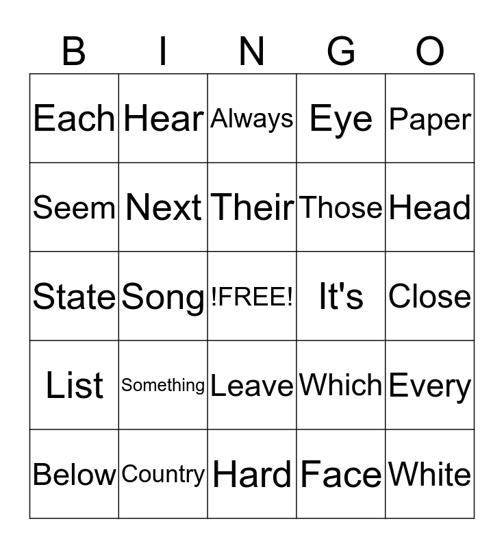 This bingo card has a free space and 34 words: Under, Story, Few, While, Close, Seem, Next, Hard, Those, White, State, Hear, Face, Watch, List, Song, Leave, It's, Every, Below, Country, Earth, Eye, Head, Along, Something, Always, Both, Paper, Each, There, Their, Which and How.