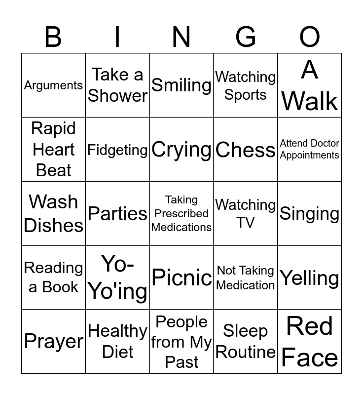 This bingo card has 41 words: Free!, Wash Dishes, Camping, Fidgeting, Healthy Diet, Picnic, Crying, Video Games, A Walk, Reading a Book, Parties, Watching Sports, Taking Prescribed Medications, Singing, Watching TV, Yo-Yo'ing, Social Isolation, Arguments, Exercise, Smiling, Yelling, Red Face, People from My Past, Chess, Listening to Music, Being Lied To, Sleep Routine, Restlessness, Attend Doctor Appointments, Confrontation, Frowning, Take a Shower, Prayer, Shooting Pool, Not Taking Medication, Rapid Heart Beat, Playing Sports, Talking to a Friend, Breathing Exercise, Sweating and Crossed Arms.