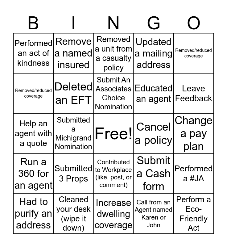 This bingo card has a free space and 24 words: Submitted 3 Props, Cleaned your desk (wipe it down), Submit An Associates Choice Nomination, Had to purify an address, Removed/reduced coverage, Performed an act of kindness, Removed/reduced coverage, Remove a named insured, Cancel a policy, Contributed to Workplace (like, post, or comment), Educated an agent, Help an agent with a quote, Submit a Cash form, Performed a #JA, Deleted an EFT, Call from an Agent named Karen or John, Change a pay plan, Removed a unit from a casualty policy, Leave Feedback, Submitted a Michigrand Nomination, Perform a Eco-Friendly Act, Run a 360 for an agent, Updated a mailing address and Increase dwelling coverage.