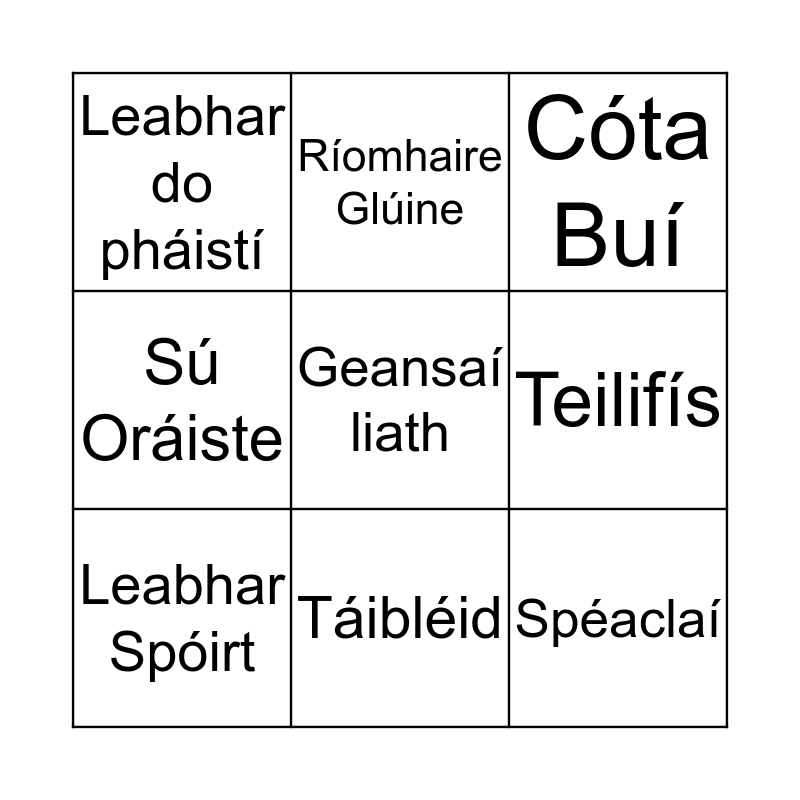 This bingo card has a free space and 11 words: Sú líomanáid, Táibléid, Spéaclaí, Leabhar Spóirt, Ríomhaire Glúine, Cóta Buí, Teilifís, Caoineog, Sú Oráiste, Leabhar do pháistí and T-léine dearg.