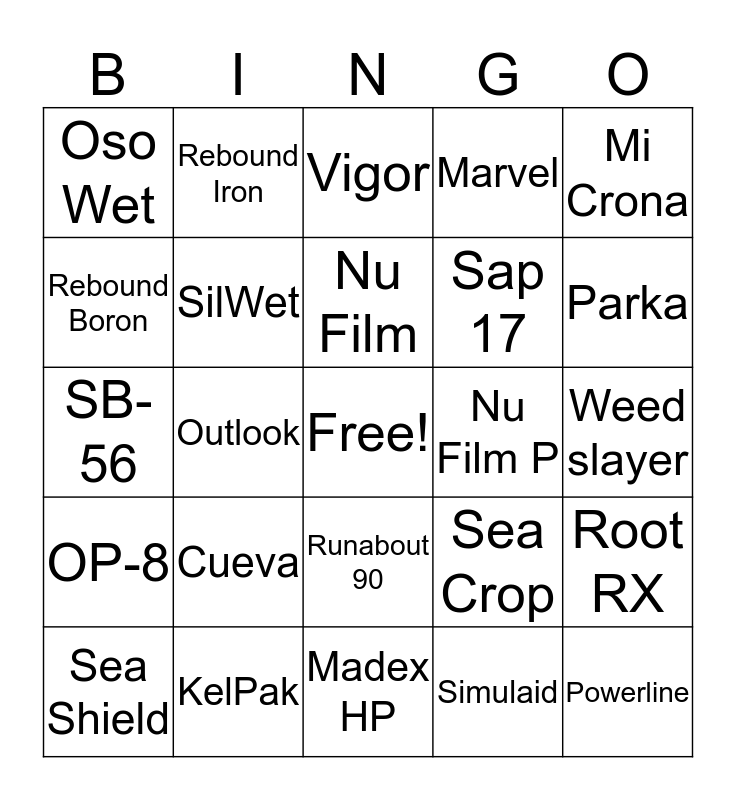 This bingo card has a free space and 24 words: Cueva, KelPak, Nu Film, Sea Shield, Mi Crona, Oso Wet, Rebound Boron, Rebound Iron, Nu Film P, Runabout 90, Sap 17, SB-56, Sea Crop, Root RX, SilWet, Simulaid, Weed slayer, Vigor, Parka, Outlook, Powerline, OP-8, Marvel and Madex HP.