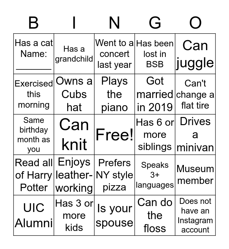 This bingo card has a free space and 29 words: UIC Alumni, Current UIC student, Can knit, Has driven cross-country, Has a cat Name: _______, Went to a concert last year, Owns a Cubs hat, Enjoys leather-working, Has 6 or more siblings, Has 3 or more kids, Drives a minivan, Does not have an Instagram account, Is your spouse, Can do the floss, Can't change a flat tire, Watched all of Game of Thrones, Prefers NY style pizza, Read all of Harry Potter, Can juggle, Same birthday month as you, Speaks 3+ languages, Traveled abroad for winter break, Got married in 2019, Exercised this morning, Has been lost in BSB, Has a grandchild, Museum member, Plays the piano and Was in a band.