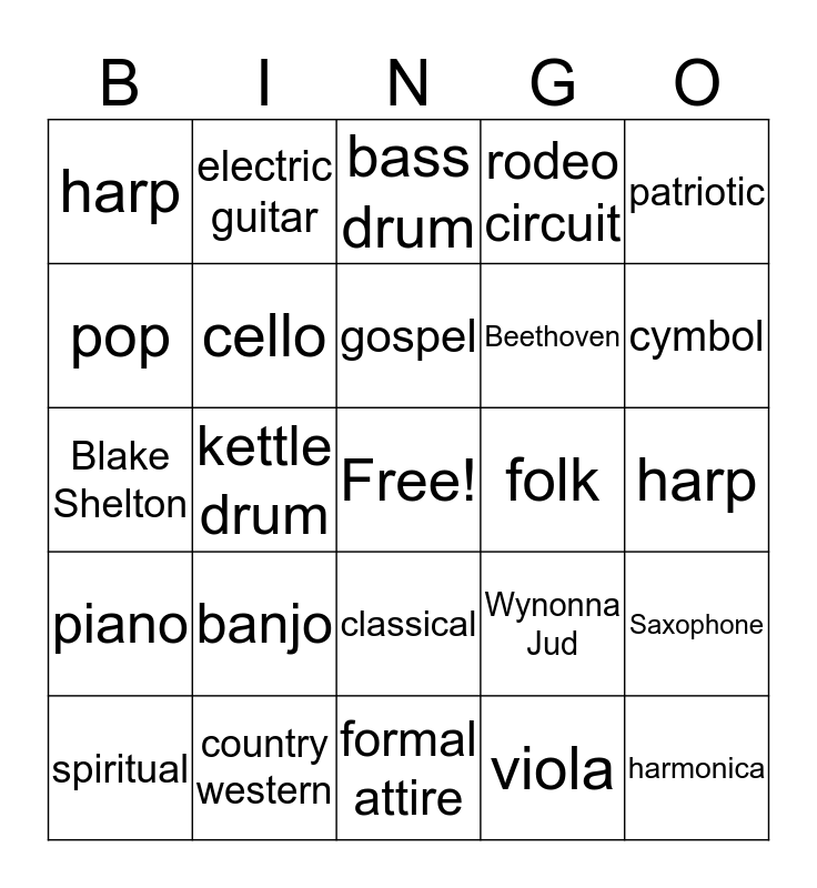 This bingo card has a free space and 24 words: banjo, country western, gospel, spiritual, patriotic, harp, pop, electric guitar, folk, classical, Beethoven, Blake Shelton, Wynonna Jud, Saxophone, cello, viola, harp, bass drum, cymbol, kettle drum, harmonica, piano, rodeo circuit and formal attire.