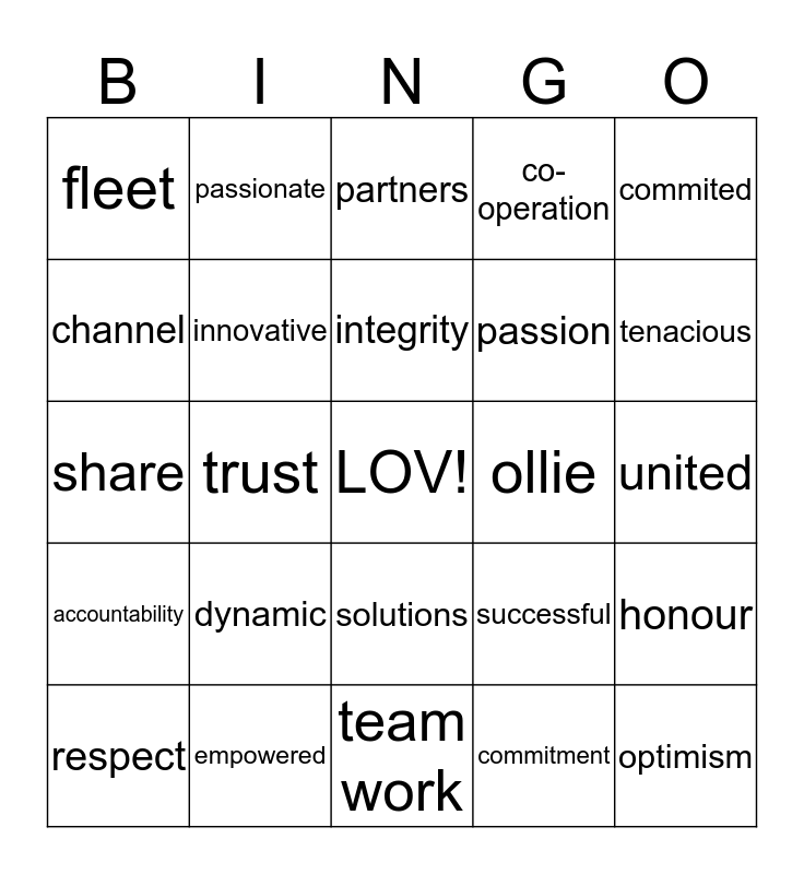 This bingo card has a free space and 24 words: dynamic, empowered, integrity, respect, commited, fleet, channel, passionate, ollie, solutions, passion, share, successful, honour, innovative, commitment, united, partners, tenacious, trust, optimism, accountability, co-operation and team work.