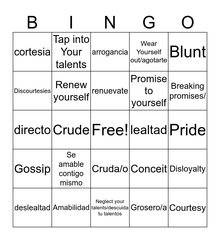 This bingo card has a free space and 47 words: Kindness, Amabilidad, Rude, Grosero/a, Pride, orgullo, Tap into Your talents, Aprovecha tus talentos, Wear Yourself out/agotarte, Courtesy, cortesia, Crude, Cruda/o, Conceit, vanidad, Be gentle to yourself, Se amable contigo mismo, Neglect your talents/descuida tu talentos, Keeping Promises/cumplir las promesas, Blunt, directo, Arrogance, arrogancia, Promise to yourself, Prometete a ti mismo, Discourtesies, Descortesia, Loyalty, lealtad, Breaking promises/, Romper promesas, Be Honest, Se honesto, Keep to yourself, Quedate para ti, Gossip, Chisme, Apologies, disculpas, Disloyalty, deslealtad, Renew yourself, renuevate, Dishonest, Deshonesto, Rumors and Rumores.