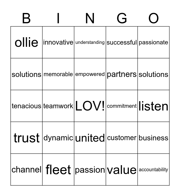 This bingo card has a free space and 24 words: dynamic, fleet, empowered, channel, passionate, ollie, solutions, innovative, commitment, united, partners, tenacious, customer, business, memorable, value, listen, understanding, solutions, teamwork, accountability, trust, successful and passion.