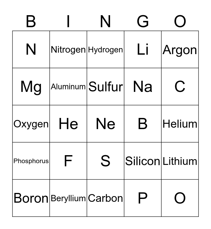 This bingo card has 36 words: Neon, Sodium, Magnesium, Aluminum, Silicon, Phosphorus, Sulfur, Chlorine, Argon, Free Space, He, Li, Be, B, C, N, O, F, Ne, Hydrogen, Helium, Lithium, Beryllium, Boron, Carbon, Nitrogen, Oxygen, Fluorine, Na, Mg, Al, Si, P, S, Cl and Ar.