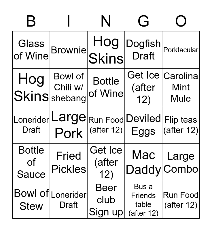 This bingo card has 30 words: Lonerider Draft, Big Pig, Large Pork, Fried Pickles, Glass of Wine, Hog Skins, Bowl of Chili w/ shebang, Get Ice (after 12), Deviled Eggs, Beer club Sign up, Flip teas (after 12), Run Food (after 12), Bus a Friends table (after 12), Run Food (after 12), Carolina Mint Mule, Big Pig, Mac Daddy, Bottle of Sauce, Fried Pickles, Porktacular, Lonerider Draft, Banana Pudding, Brownie, Get Ice (after 12), Hog Skins, Dogfish Draft, Large Combo, Bowl of Stew, Bottle of Wine and Bread Pudding.