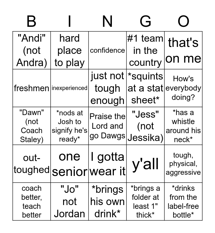 This bingo card has a free space and 29 words: coach better, teach better, my staff, *nods at Josh to signify he's ready*, we're a young team, "Andi" (not Andra), confidence, inexperienced, one senior, "Jess" (not Jessika), "Jo" not Jordan, *has a whistle around his neck*, *drinks from the label-free bottle*, *brings his own drink*, *brings a folder at least 1" thick*, How's everybody doing?, knock-down, drag-out, I gotta wear it, out-toughed, that's on me, "Dawn" (not Coach Staley), y'all, *looks at Josh for an answer*, *squints at a stat sheet*, freshmen, #1 team in the country, hard place to play, tough, physical, aggressive, just not tough enough and gotta rebound.