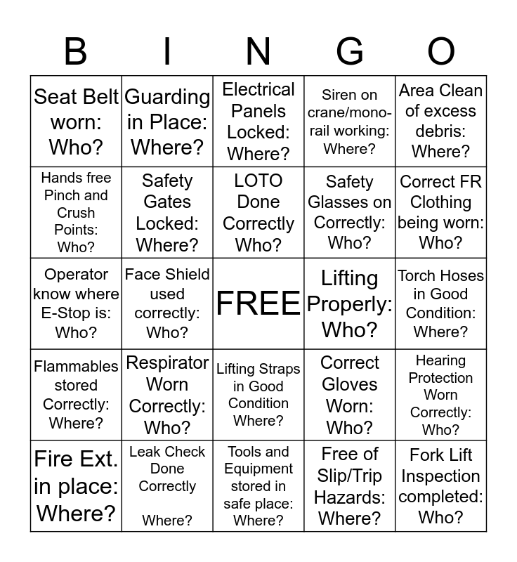 This bingo card has a free space and 24 words: Respirator Worn Correctly: Who?, Leak Check Done Correctly Where?, LOTO Done Correctly Who?, Fire Ext. in place: Where?, Area Clean of excess debris: Where?, Seat Belt worn: Who?, Hands free Pinch and Crush Points: Who?, Guarding in Place: Where?, Lifting Properly: Who?, Lifting Straps in Good Condition Where?, Safety Glasses on Correctly: Who?, Operator know where E-Stop is: Who?, Correct Gloves Worn: Who?, Hearing Protection Worn Correctly: Who?, Safety Gates Locked: Where?, Free of Slip/Trip Hazards: Where?, Torch Hoses in Good Condition: Where?, Electrical Panels Locked: Where?, Correct FR Clothing being worn: Who?, Face Shield used correctly: Who?, Fork Lift Inspection completed: Who?, Flammables stored Correctly: Where?, Siren on crane/mono-rail working: Where? and Tools and Equipment stored in safe place: Where?.