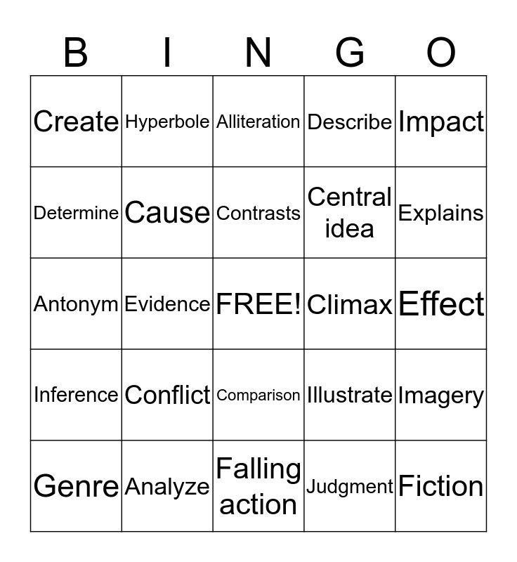 This bingo card has a free space and 24 words: Conflict, Analyze, Contrasts, Genre, Impact, Create, Determine, Hyperbole, Climax, Comparison, Central idea, Antonym, Illustrate, Imagery, Cause, Judgment, Effect, Alliteration, Explains, Evidence, Fiction, Inference, Describe and Falling action.