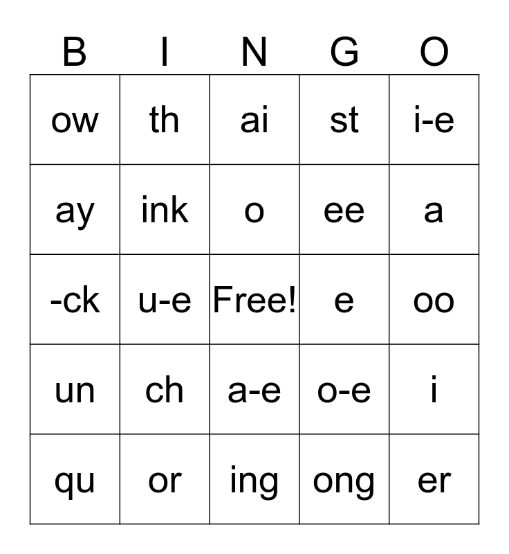 This bingo card has a free space and 29 words: qu, igh, u-e, y, ow, ai, ink, ch, e, or, oo, er, ing, ong, a, unk, a-e, un, i-e, -ck, o-e, ar, ee, ay, st, th, i, o and ang.