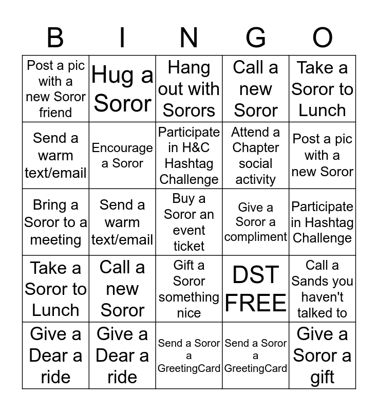 This bingo card has 25 words: Call a new Soror, Send a Soror a GreetingCard, Participate in H&C Hashtag Challenge, Give a Dear a ride, Take a Soror to Lunch, Post a pic with a new Soror friend, Send a warm text/email, Hug a Soror, Give a Soror a compliment, Gift a Soror something nice, Attend a Chapter social activity, Bring a Soror to a meeting, DST FREE, Call a Sands you haven't talked to, Encourage a Soror, Give a Soror a gift, Participate in Hashtag Challenge, Hang out with Sorors, Post a pic with a new Soror, Send a warm text/email, Buy a Soror an event ticket, Give a Dear a ride, Take a Soror to Lunch, Call a new Soror and Send a Soror a GreetingCard.