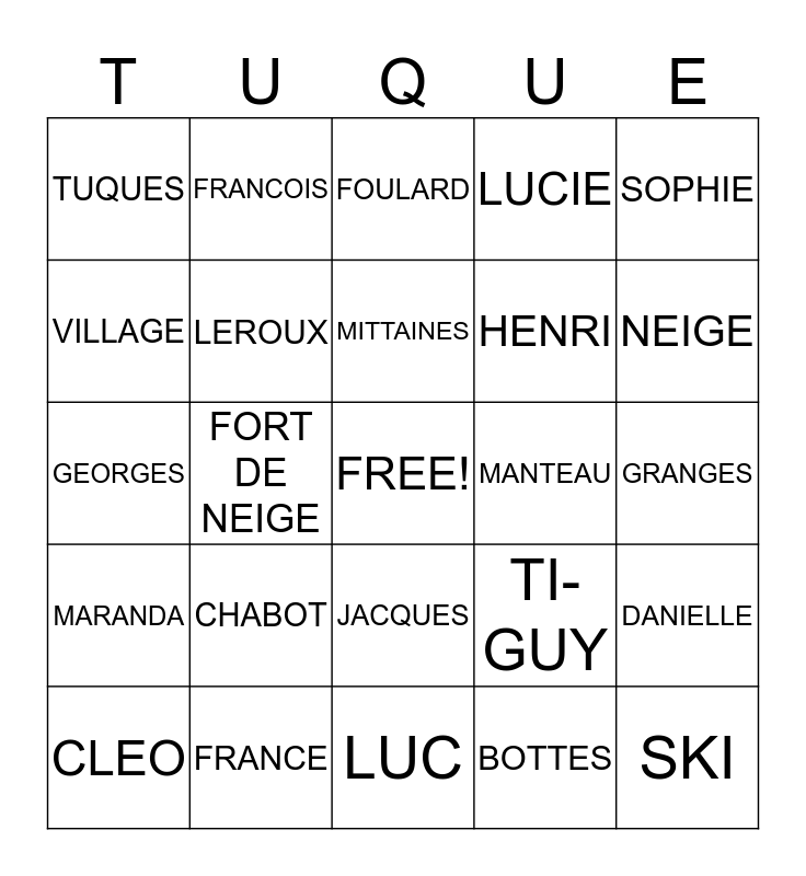 This bingo card has a free space and 24 words: CHABOT, FRANCE, MITTAINES, CLEO, SOPHIE, TUQUES, VILLAGE, FRANCOIS, MANTEAU, JACQUES, HENRI, GEORGES, TI-GUY, DANIELLE, LEROUX, BOTTES, GRANGES, FOULARD, NEIGE, FORT DE NEIGE, SKI, MARANDA, LUCIE and LUC.
