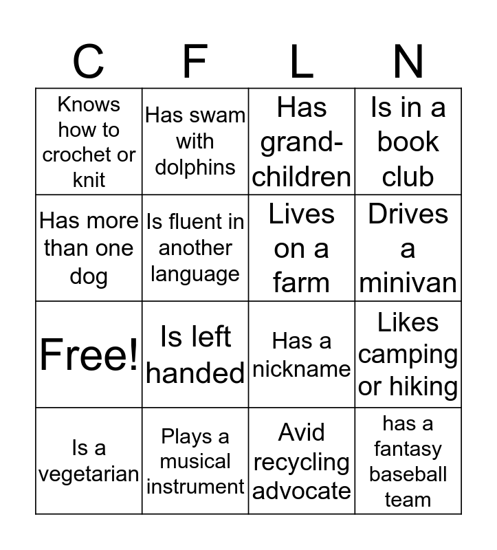 This bingo card has 20 words: Likes camping or hiking, Going to the beach this summer, Has grand-children, Doesn't have a Facebook page, Is a vegetarian, Has more than one dog, Plays a musical instrument, Knows how to crochet or knit, Free!, Has swam with dolphins, Is left handed, Has a nickname, Is fluent in another language, has a fantasy baseball team, Lives on a farm, Has run a half marathon, Drives a minivan, Is in a book club, Avid recycling advocate and Has climbed a mountain.