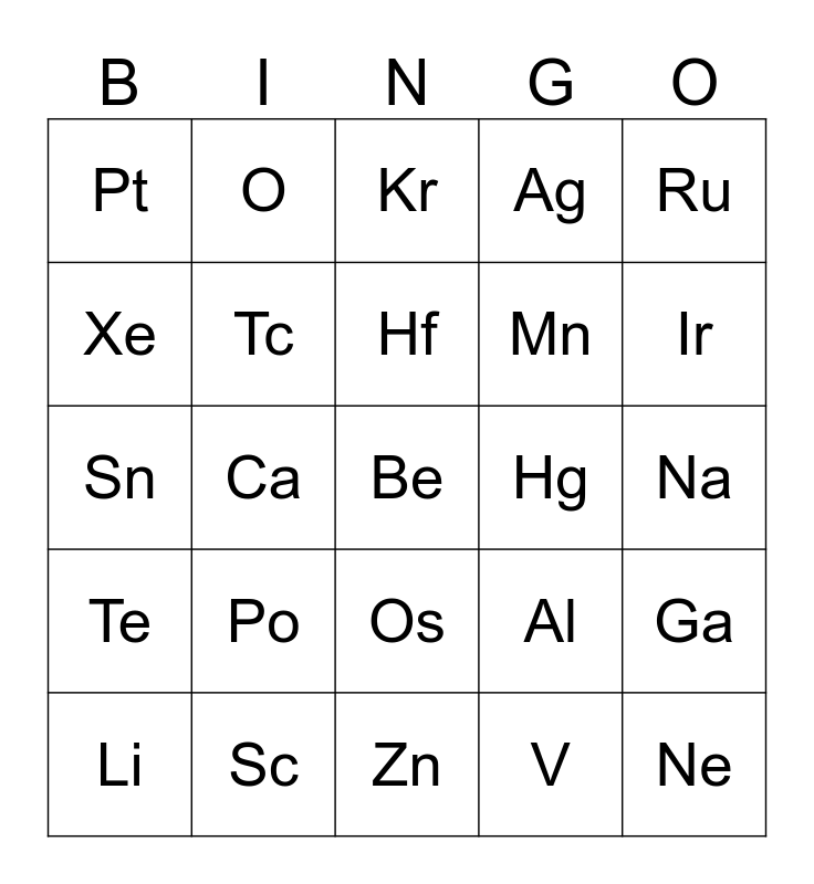 This bingo card has 31 words: Zn, La, Ca, In, Pt, Kr, Tc, Al, Hg, V, Na, Be, Ne, Sb, Ir, Si, Ga, Po, Te, Os, Ru, Pb, Li, O, Mn, Xe, Ag, Sn, Sc, Hf and Tl.