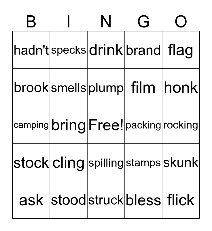 This bingo card has a free space and 26 words: spilling, bless, plump, stood, flag, hadn't, brook, specks, rocking, stamps, film, camping, skunk, ask, bring, crust, brand, stock, drink, flick, honk, struck, packing, cling, smells and it's.