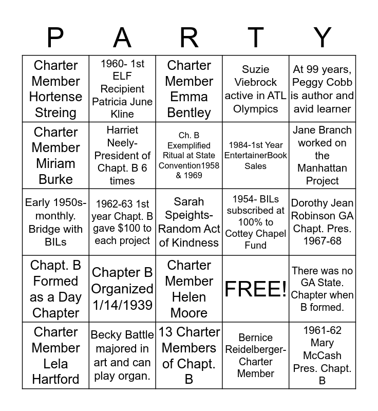 This bingo card has 25 words: Chapter B Organized 1/14/1939, 13 Charter Members of Chapt. B, Ch. B Exemplified Ritual at State Convention1958 & 1969, Charter Member Lela Hartford, At 99 years, Peggy Cobb is author and avid learner, Charter Member Hortense Streing, Charter Member Miriam Burke, 1960- 1st ELF Recipient Patricia June Kline, 1954- BILs subscribed at 100% to Cottey Chapel Fund, Charter Member Helen Moore, 1984-1st Year EntertainerBook Sales, Early 1950s-monthly. Bridge with BILs, FREE!, There was no GA State. Chapter when B formed., Harriet Neely- President of Chapt. B 6 times, 1961-62 Mary McCash Pres. Chapt. B, Dorothy Jean Robinson GA Chapt. Pres. 1967-68, Charter Member Emma Bentley, Jane Branch worked on the Manhattan Project, 1962-63 1st year Chapt. B gave $100 to each project, Sarah Speights-Random Act of Kindness, Becky Battle majored in art and can play organ., Chapt. B Formed as a Day Chapter, Suzie Viebrock active in ATL Olympics and Bernice Reidelberger- Charter Member.