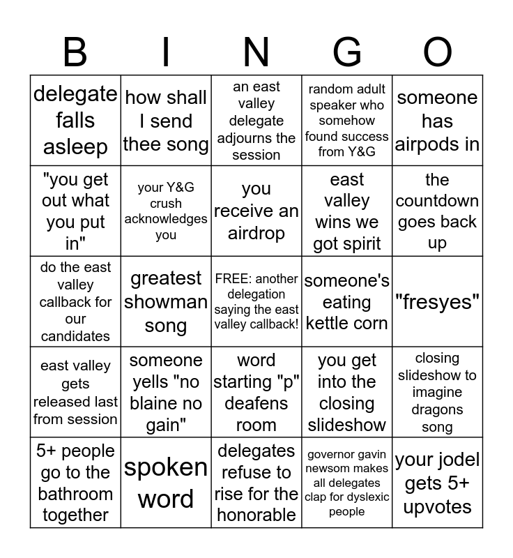 This bingo card has a free space and 24 words: someone yells "no blaine no gain", spoken word, you receive an airdrop, 5+ people go to the bathroom together, someone has airpods in, delegate falls asleep, "you get out what you put in", how shall I send thee song, someone's eating kettle corn, word starting "p" deafens room, east valley wins we got spirit, do the east valley callback for our candidates, you get into the closing slideshow, closing slideshow to imagine dragons song, your Y&G crush acknowledges you, governor gavin newsom makes all delegates clap for dyslexic people, "fresyes", an east valley delegate adjourns the session, the countdown goes back up, greatest showman song, your jodel gets 5+ upvotes, east valley gets released last from session, random adult speaker who somehow found success from Y&G and delegates refuse to rise for the honorable.