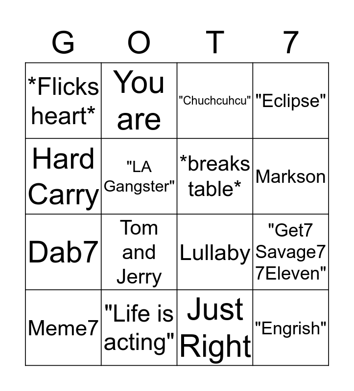 This bingo card has 16 words: "Life is acting", "Get7 Savage7 7Eleven", "Chuchcuhcu", *Flicks heart*, Dab7, You are, Lullaby, Just Right, Hard Carry, "LA Gangster", Meme7, "Eclipse", Tom and Jerry, Markson, *breaks table* and "Engrish".