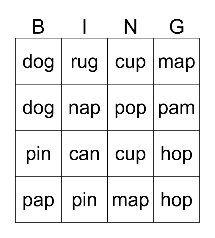 ⚠ This card has duplicate items: dig (2), run (2), hop (2), pig (2), dog (2), cup (2), pop (2), rug (2), pin (2), nap (2), map (2), pap (2), pan (2), pam (2), can (2)