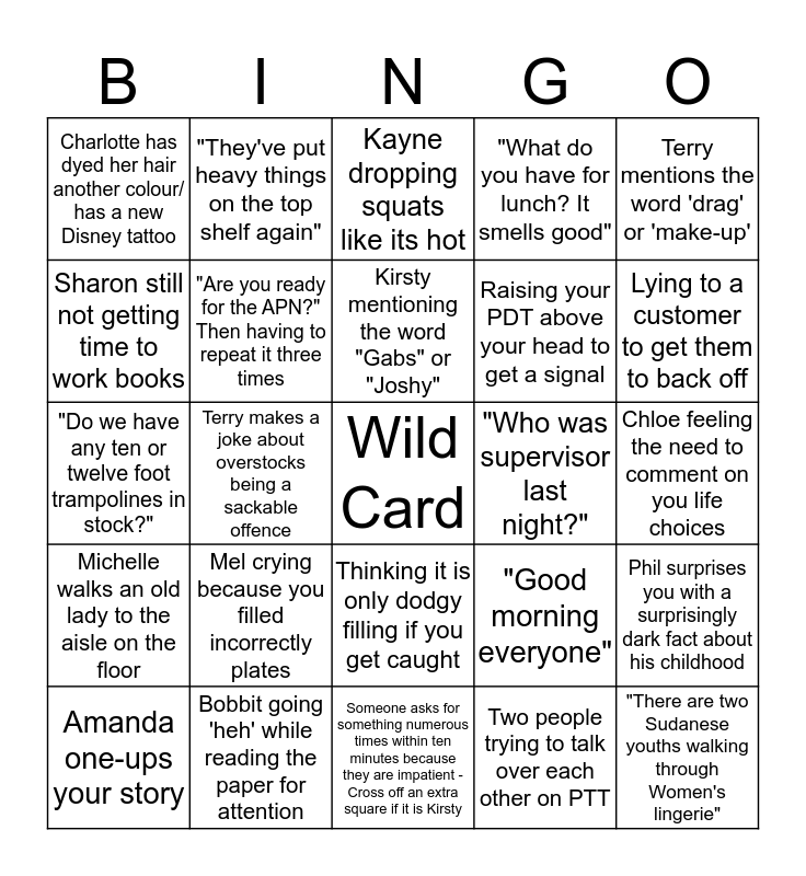 This bingo card has a free space and 24 words: Mel crying because you filled incorrectly plates, Bobbit going 'heh' while reading the paper for attention, Kirsty mentioning the word "Gabs" or "Joshy", Amanda one-ups your story, Terry mentions the word 'drag' or 'make-up', Charlotte has dyed her hair another colour/ has a new Disney tattoo, Sharon still not getting time to work books, "They've put heavy things on the top shelf again", "Who was supervisor last night?", Thinking it is only dodgy filling if you get caught, Raising your PDT above your head to get a signal, "Do we have any ten or twelve foot trampolines in stock?", "Good morning everyone", Phil surprises you with a surprisingly dark fact about his childhood, "Are you ready for the APN?" Then having to repeat it three times, Two people trying to talk over each other on PTT, Chloe feeling the need to comment on you life choices, Kayne dropping squats like its hot, Lying to a customer to get them to back off, Terry makes a joke about overstocks being a sackable offence, "There are two Sudanese youths walking through Women's lingerie", Michelle walks an old lady to the aisle on the floor, "What do you have for lunch? It smells good" and Someone asks for something numerous times within ten minutes because they are impatient - Cross off an extra square if it is Kirsty.
