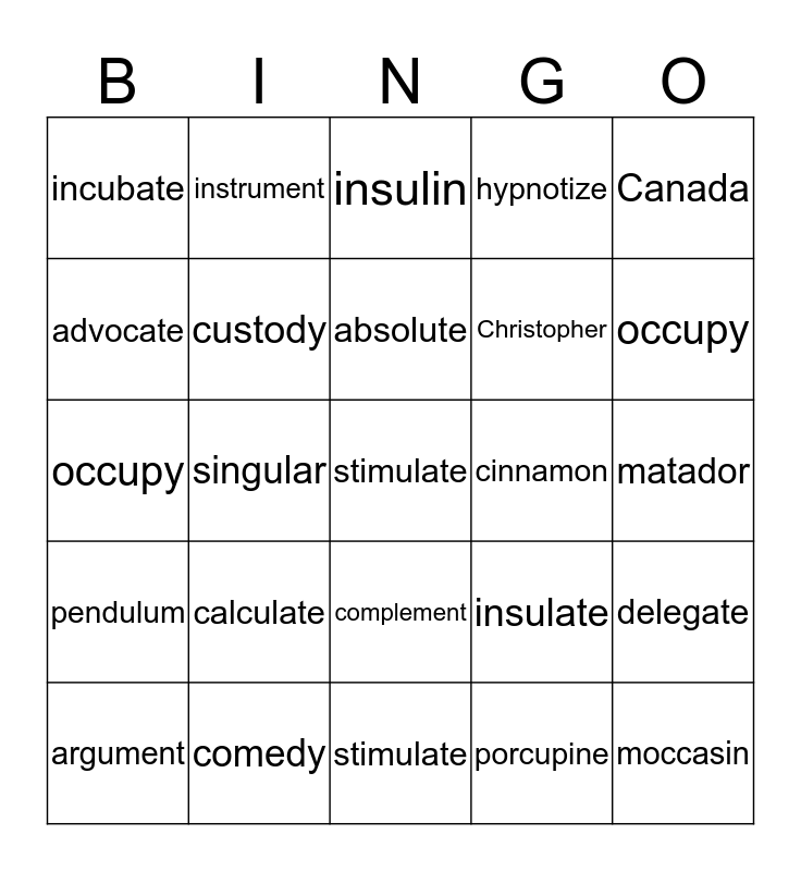 This bingo card has a free space and 24 words: calculate, comedy, absolute, argument, Canada, incubate, advocate, instrument, cinnamon, complement, Christopher, occupy, insulate, delegate, custody, porcupine, matador, insulin, occupy, singular, moccasin, pendulum, hypnotize and stimulate.