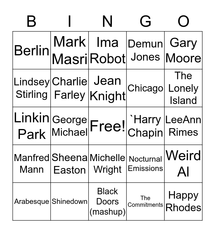 This bingo card has a free space and 56 words: Jack Savoretti, Arabesque, B.o.B, Berlin, Black Doors (mashup), Blue October, Charlie Farley, Charlie Puth, Chicago, Danny Worsnop, Demun Jones, Denis Leary, Drowning Pool, Dusty, Dan Fogelberg, Fire Fences, Gary Moore, George Michael, Godsmack, Happy Rhodes, `Harry Chapin, Harvey Danger, Nocturnal Emissions, Ima Robot, Imelda May, Jean Knight, Jefferson Starship, Jennifer Lawrence, The Lonely Island, Jordan Davis, Julie Brown, Keith Urban, Lady Gaga, Lansdowne, LeeAnn Rimes, Lindsey Stirling, Linkin Park, Lukas Graham, Manfred Mann, Mark Masri, Michelle Wright, Miley Cyrus, Pilot, Pink Floyd, Queen, Sheena Easton, Shinedown, Showadaddywaddy, The Veronicas, the Wreckers, The Commitments, Thin Lizzy, Tim Nelson, Tool, Weird Al and D J Lubel.