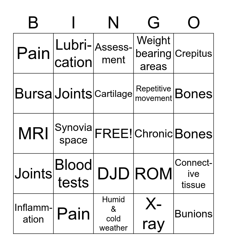This bingo card has a free space and 24 words: Blood tests, Pain, Cartilage, Inflamm- ation, Crepitus, Pain, Bursa, Lubri- cation, Chronic, DJD, Repetitive movement, MRI, ROM, Connect- ive tissue, Joints, X-ray, Bones, Assess- ment, Bones, Synovia space, Bunions, Joints, Weight bearing areas and Humid & cold weather.