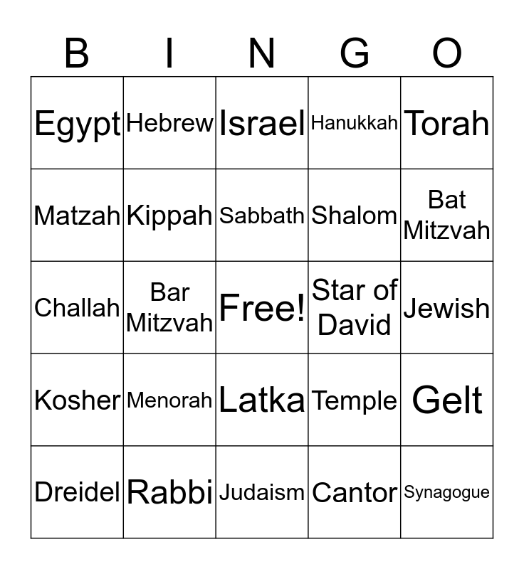 This bingo card has a free space and 24 words: Menorah, Rabbi, Sabbath, Dreidel, Torah, Egypt, Matzah, Hebrew, Star of David, Latka, Shalom, Challah, Temple, Gelt, Kippah, Cantor, Jewish, Israel, Bat Mitzvah, Bar Mitzvah, Synagogue, Kosher, Hanukkah and Judaism.