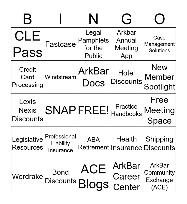 This bingo card has a free space and 26 words: ABA Retirement, ArkBar Career Center, ArkBar Docs, Bond Discounts, Case Management Solutions, CLE Pass, Credit Card Processing, Fastcase, Free Meeting Space, Health Insurance, Hotel Discounts, Lexis Nexis Discounts, Shipping Discounts, Wordrake, SNAP, ArkBar Mobile App, Arkbar Annual Meeting App, Legislative Resources, Legal Pamphlets for the Public, ArkBar Community Exchange (ACE), New Member Spotlight, ACE Blogs, Practice Handbooks, Professional Liability Insurance, Windstream and SoFi.