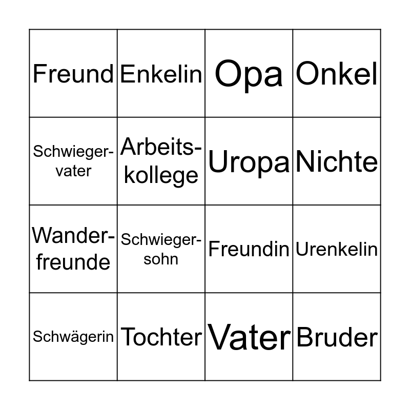 This bingo card has 19 words: Freundin, Enkel, Opa, Bruder, Urenkelin, Schwieger- vater, Vater, Freund, Enkelin, Wander- freunde, Schwieger- sohn, Arbeits- kollege, Uropa, Tochter, Schwägerin, Schwager, Onkel, Nichte and Garten- nachbar.