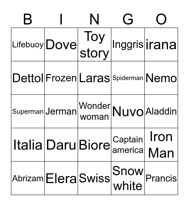 This bingo card has a free space and 24 words: Daru, Elera, Laras, Abrizam, irana, Lifebuoy, Dettol, Dove, Nuvo, Biore, Spiderman, Superman, Captain america, Iron Man, Frozen, Snow white, Aladdin, Toy story, Nemo, Jerman, Prancis, Italia, Inggris and Swiss.