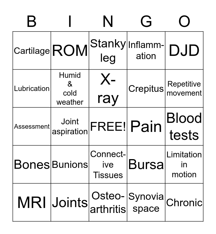 This bingo card has a free space and 24 words: Bunions, Joints, X-ray, MRI, DJD, Cartilage, Lubrication, ROM, Pain, Connect- ive Tissues, Crepitus, Assessment, Bursa, Limitation in motion, Humid & cold weather, Synovia space, Blood tests, Stanky leg, Repetitive movement, Joint aspiration, Chronic, Bones, Inflamm- ation and Osteo- arthritis.
