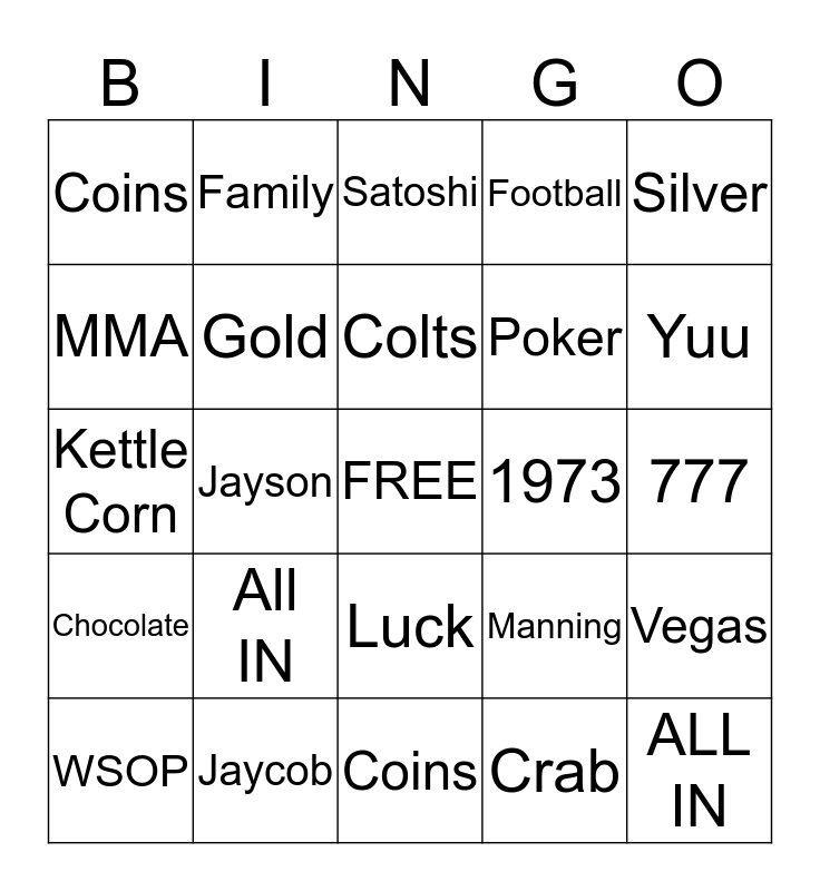 This bingo card has a free space and 24 words: All IN, Jaycob, Colts, WSOP, Silver, Coins, MMA, Family, 1973, Luck, Poker, Kettle Corn, Manning, Vegas, Gold, Crab, 777, Satoshi, Yuu, Jayson, ALL IN, Chocolate, Football and Coins.