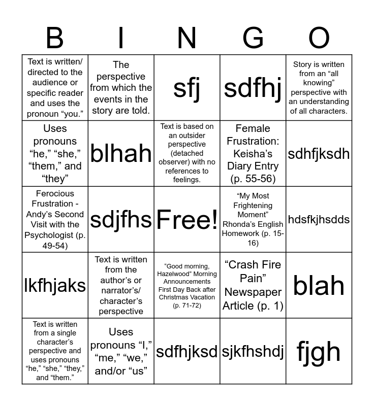 This bingo card has a free space and 24 words: Text is written from the author’s or narrator’s/ character’s perspective, Uses pronouns “I,” “me,” “we,” and/or “us”, Text is based on an outsider perspective (detached observer) with no references to feelings., Text is written from a single character’s perspective and uses pronouns “he,” “she,” “they,” and “them.”, Story is written from an “all knowing” perspective with an understanding of all characters., Text is written/ directed to the audience or specific reader and uses the pronoun “you.”, Uses pronouns “he,” “she,” “them,” and “they”, The perspective from which the events in the story are told., “My Most Frightening Moment” Rhonda’s English Homework (p. 15-16), “Good morning, Hazelwood” Morning Announcements First Day Back after Christmas Vacation (p. 71-72), Female Frustration: Keisha’s Diary Entry (p. 55-56), Ferocious Frustration - Andy’s Second Visit with the Psychologist (p. 49-54), “Crash Fire Pain” Newspaper Article (p. 1), blah, blhah, sjkfhshdj, hdsfkjhsdds, sfj, sdhfjksdh, sdjfhs, fjgh, lkfhjaks, sdfhj and sdfhjksd.