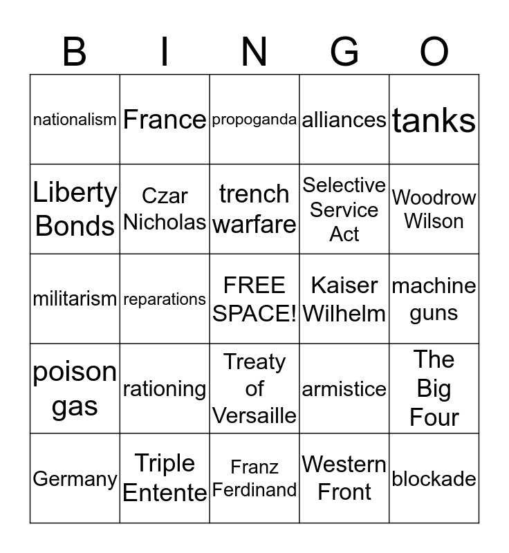 This bingo card has a free space and 34 words: Zimmerman Note, Western Front, Triple Alliance, Eastern Front, poison gas, Czar Nicholas, tanks, Germany, France, The Balkans, trench warfare, propoganda, submarine or U-boats, Schlieffen Plan, Kaiser Wilhelm, Woodrow Wilson, Triple Entente, militarism, rationing, armistice, Treaty of Versaille, stalemate, nationalism, machine guns, Franz Ferdinand, blockade, alliances, Lusitania, Selective Service Act, Liberty Bonds, League of Nations, reparations, The Big Four and isolationism.
