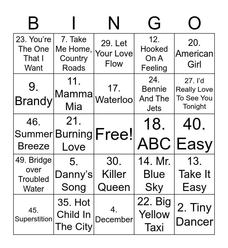 This bingo card has a free space and 50 words: 1. Landslide, 2. Tiny Dancer, 3. Signed, Sealed, Delivered, 4. December, 5. Danny’s Song, 6. American Pie, 7. Take Me Home, Country Roads, 8. Isn’t She Lovely, 9. Brandy, 10. Your Song, 11. Mamma Mia, 12. Hooked On A Feeling, 13. Take It Easy, 14. Mr. Blue Sky, 15. Don’t Stop Me Now, 16. Let It Be, 17. Waterloo, 18. ABC, 19. Dancing In The Moonlight, 20. American Girl, 21. Burning Love, 22. Big Yellow Taxi, 23. You’re The One That I Want, 24. Bennie And The Jets, 25. Fire and Rain, 26. Love Of My Life, 27. I’d Really Love To See You Tonight, 28. Sweet Home Alabama, 29. Let Your Love Flow, 30. Killer Queen, 31. S.O.S., 32. The Joker, 33. Annie’s Song, 34. Coat of Many Colors, 35. Hot Child In The City, 36. I’ll Be There, 37. Sir Duke, 38. Born To Run, 39. Best of My Love, 40. Easy, 41. Ain’t No Mountain High Enough, 42. Blame It on the Boogie, 43. Kung Fu Fighting, 44. Rock & Roll All Nite, 45. Superstition, 46. Summer Breeze, 47. A Horse with No Name, 48. You’ve Got a Friend, 49. Bridge over Troubled Water and 50. Listen to the Music.