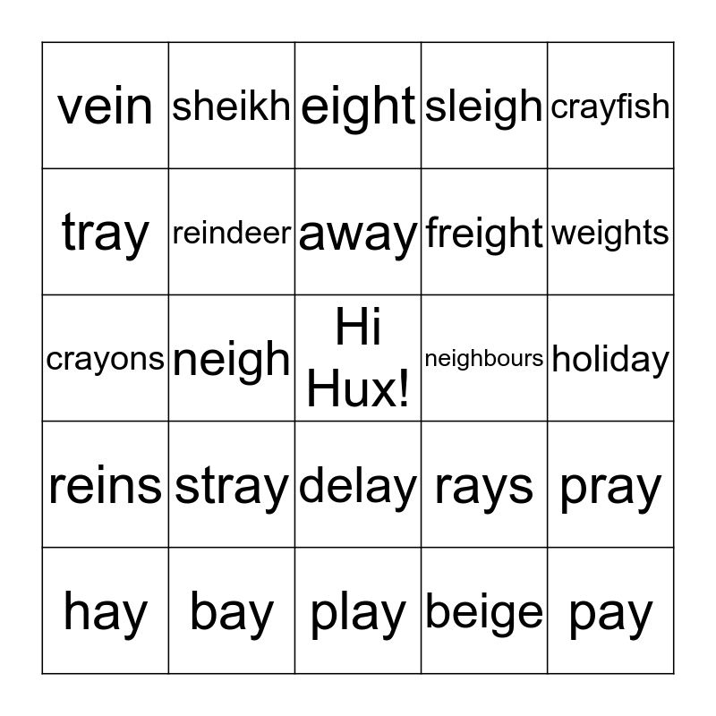 This bingo card has a free space and 27 words: rays, clay, freight, play, tray, eight, sheikh, reins, neighbours, pray, crayons, sleigh, hay, bay, weights, spray, reindeer, away, stray, vein, holiday, beige, neigh, pay, delay, crayfish and reign.