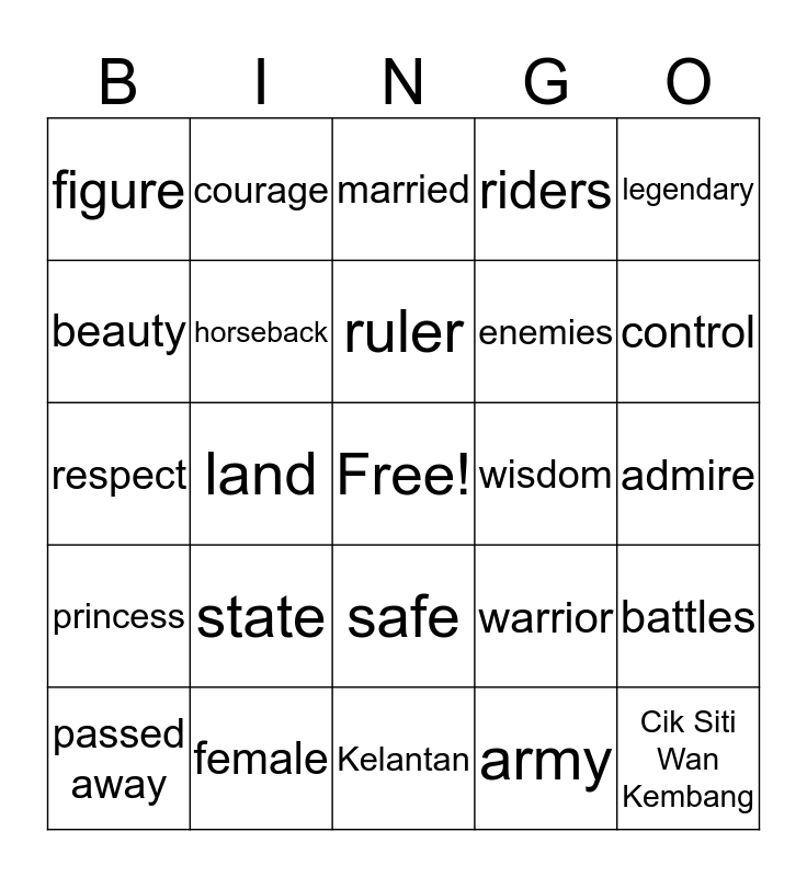 This bingo card has a free space and 24 words: state, female, ruler, passed away, legendary, figure, beauty, courage, wisdom, safe, enemies, respect, warrior, battles, horseback, army, admire, married, control, land, Cik Siti Wan Kembang, princess, riders and Kelantan.