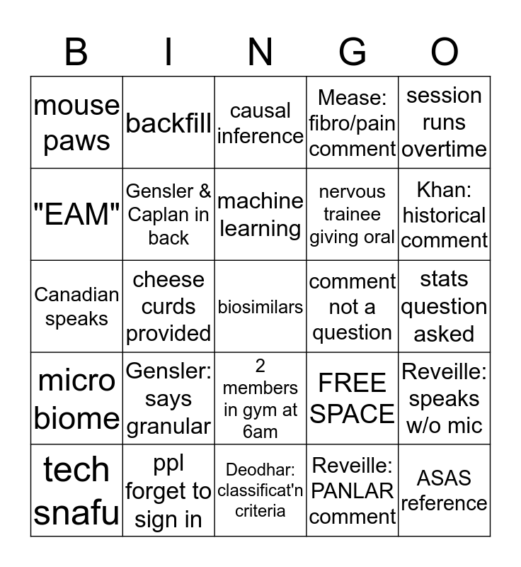 This bingo card has 25 words: Gensler: says granular, Deodhar: classificat'n criteria, machine learning, tech snafu, session runs overtime, mouse paws, "EAM", backfill, comment not a question, 2 members in gym at 6am, nervous trainee giving oral, Canadian speaks, FREE SPACE, Reveille: speaks w/o mic, Gensler & Caplan in back, ASAS reference, stats question asked, causal inference, Khan: historical comment, cheese curds provided, biosimilars, ppl forget to sign in, micro biome, Mease: fibro/pain comment and Reveille: PANLAR comment.