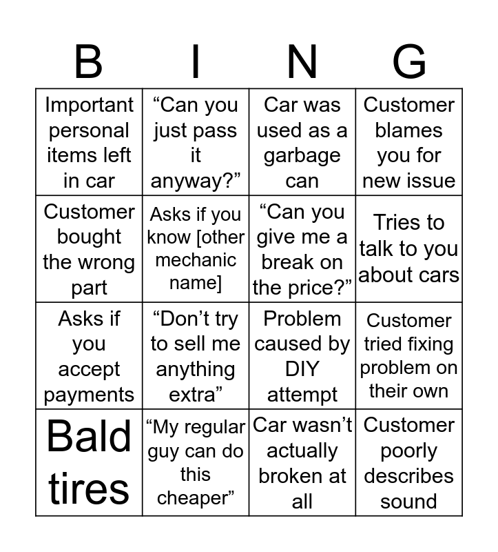 This bingo card has 16 words: “My regular guy can do this cheaper”, Customer tried fixing problem on their own, Car was used as a garbage can, Important personal items left in car, Asks if you accept payments, “Can you just pass it anyway?”, Problem caused by DIY attempt, Car wasn’t actually broken at all, Customer bought the wrong part, Asks if you know [other mechanic name], Bald tires, Customer blames you for new issue, “Don’t try to sell me anything extra”, Tries to talk to you about cars, “Can you give me a break on the price?” and Customer poorly describes sound.