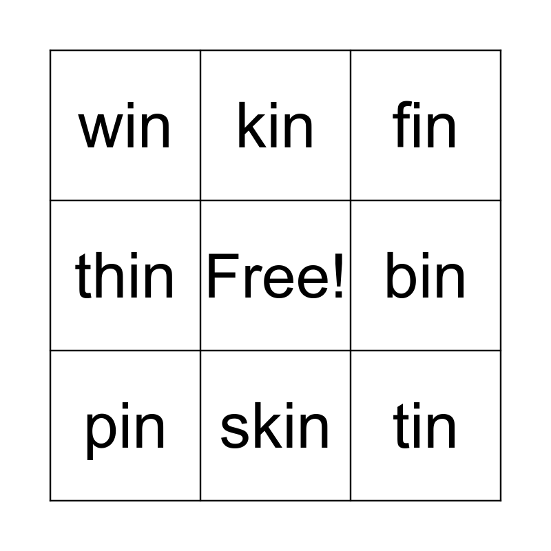 This bingo card has a free space and 8 words: bin, fin, kin, pin, win, tin, thin and skin.