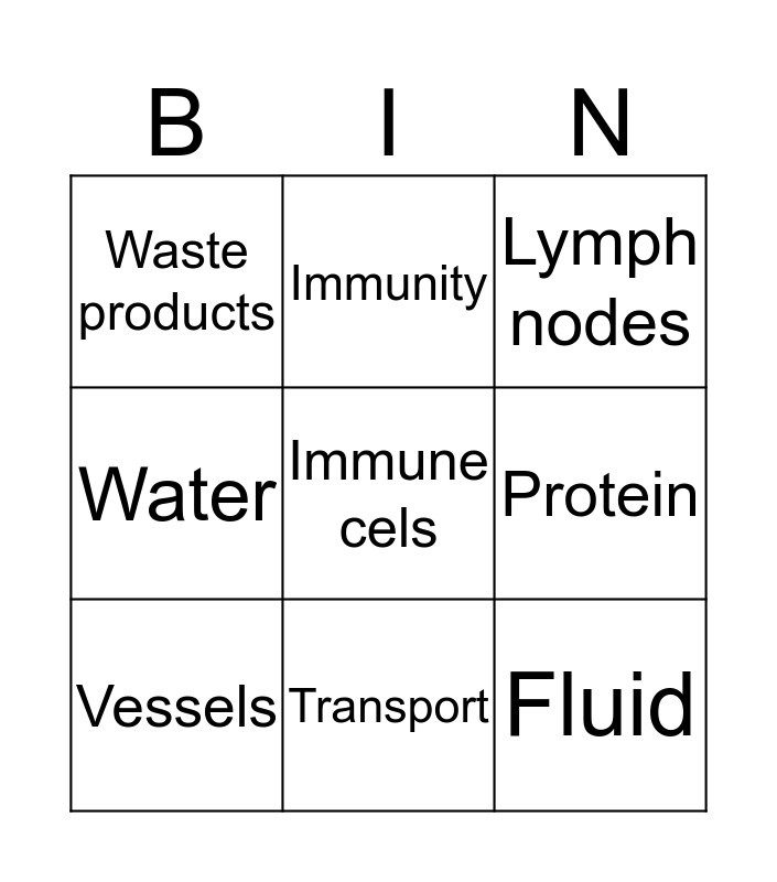This bingo card has 12 words: Drainage, Fluid, Immune cels, Protein, Immunity, Lymph nodes, Transport, No pump, Waste products, Water, Vessels and Circulatory system.