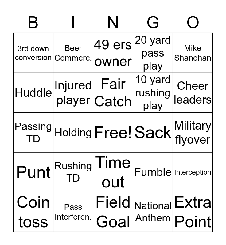 This bingo card has a free space and 33 words: Miami skyline, Joe Montana, Holding, Off sides, Punt, Injured player, Mike Shanohan, Coin toss, Beer Commerc., Soda Commerc., Fair Catch, 49 ers owner, Chiefs Owner, Challenge flag, Sack, Cheer leaders, Pass Interferen., Passing TD, Rushing TD, Fumble, Time out, Face paint fan, 3rd down conversion, Military flyover, Field Goal, Extra Point, 20 yard pass play, 10 yard rushing play, Huddle, Interception, Doritos Commerc., National Anthem and Fan with shirt off.